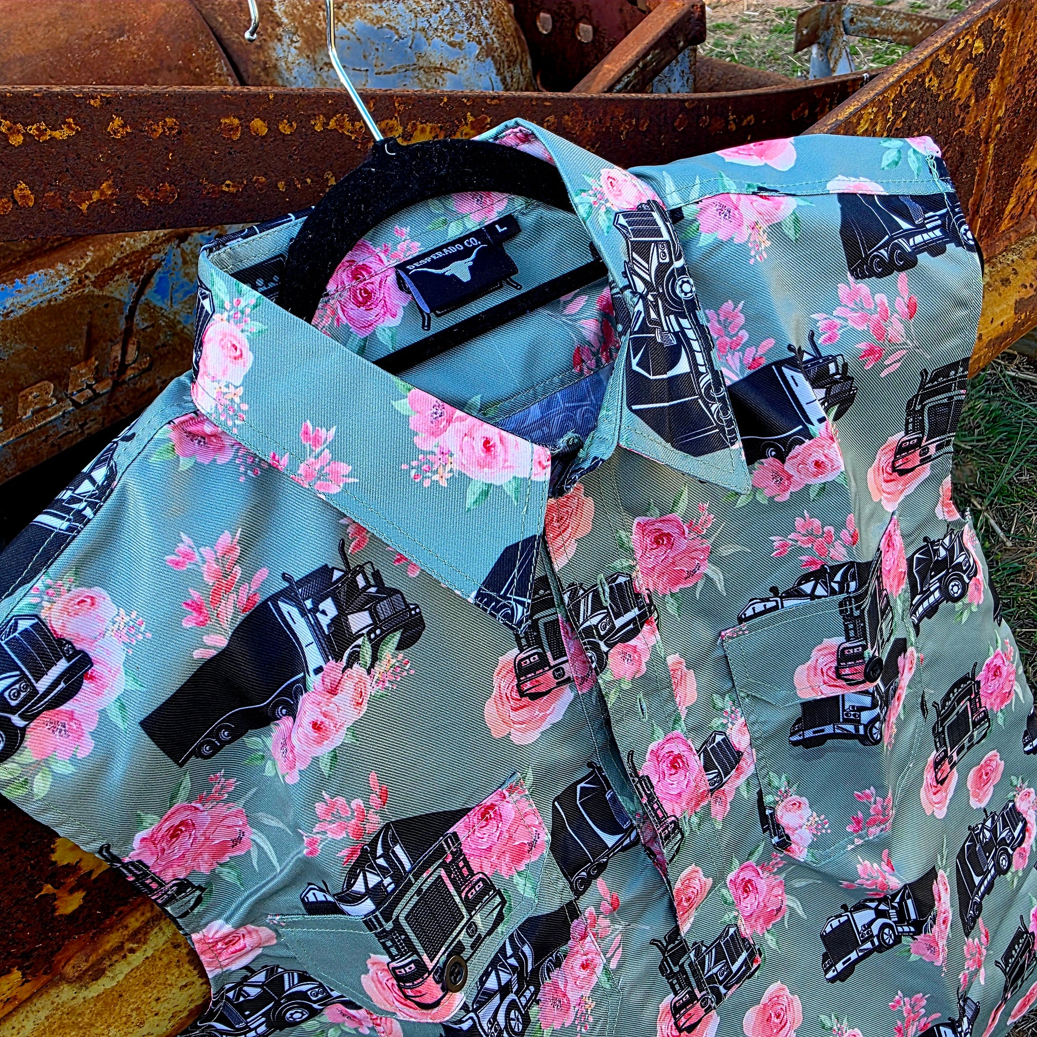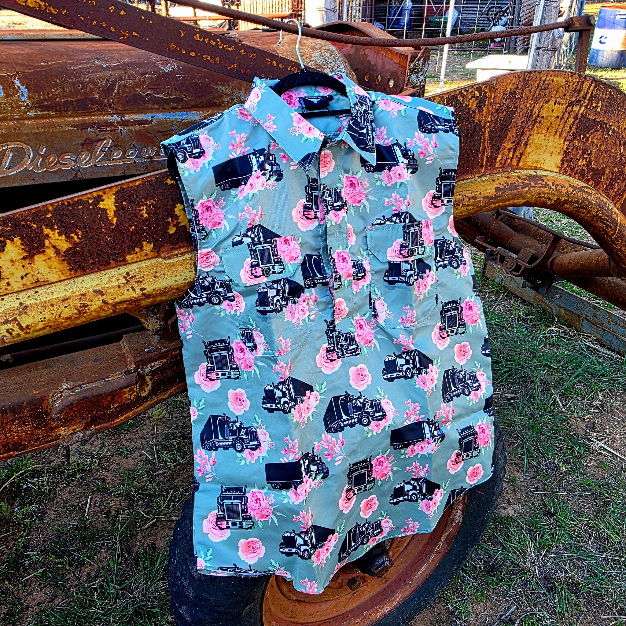 Desperado Co. Sleeveless Work Shirt Mint Trucks & Roses