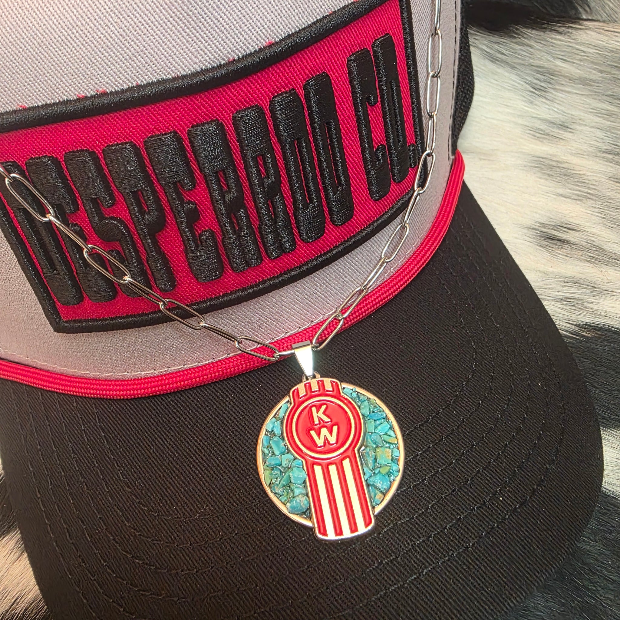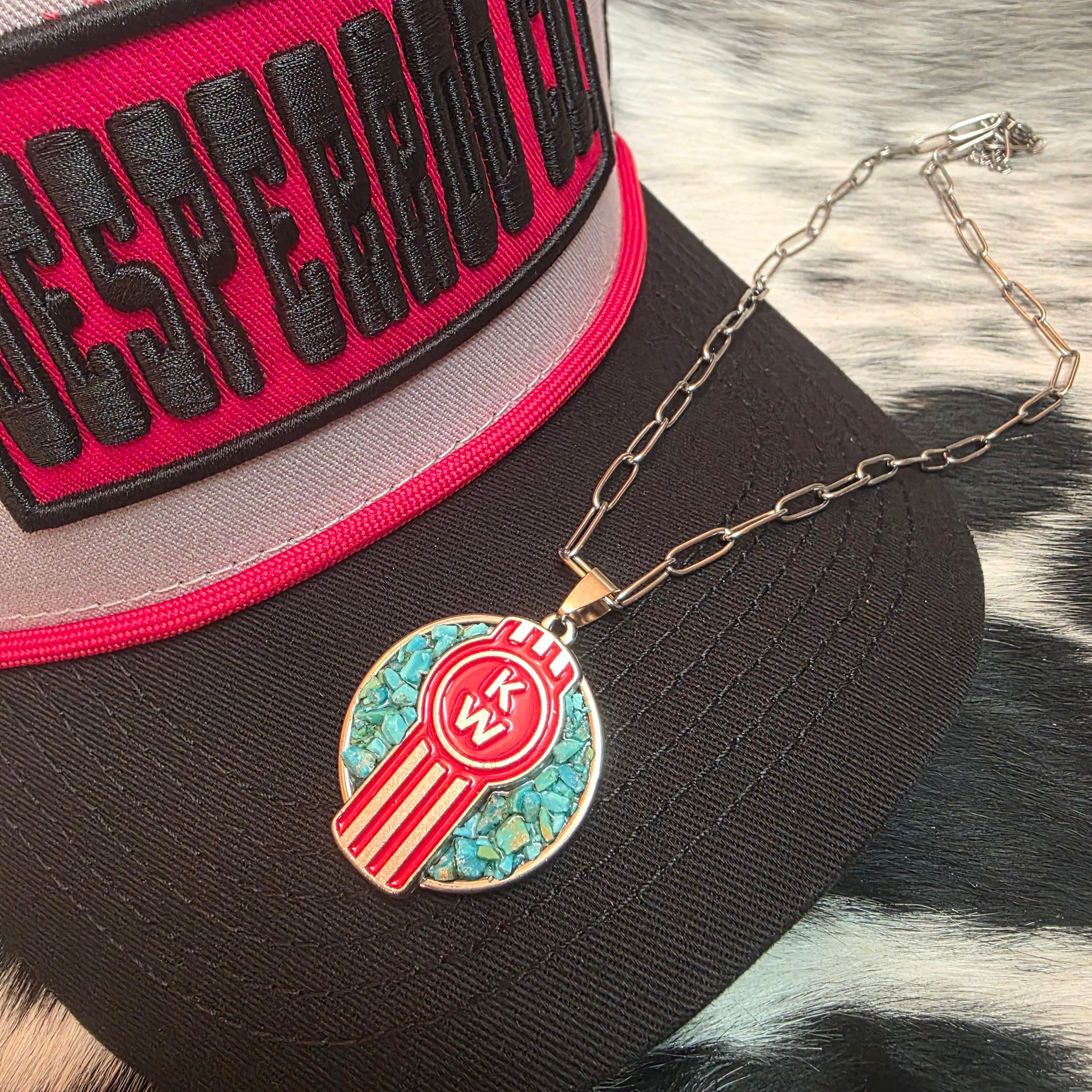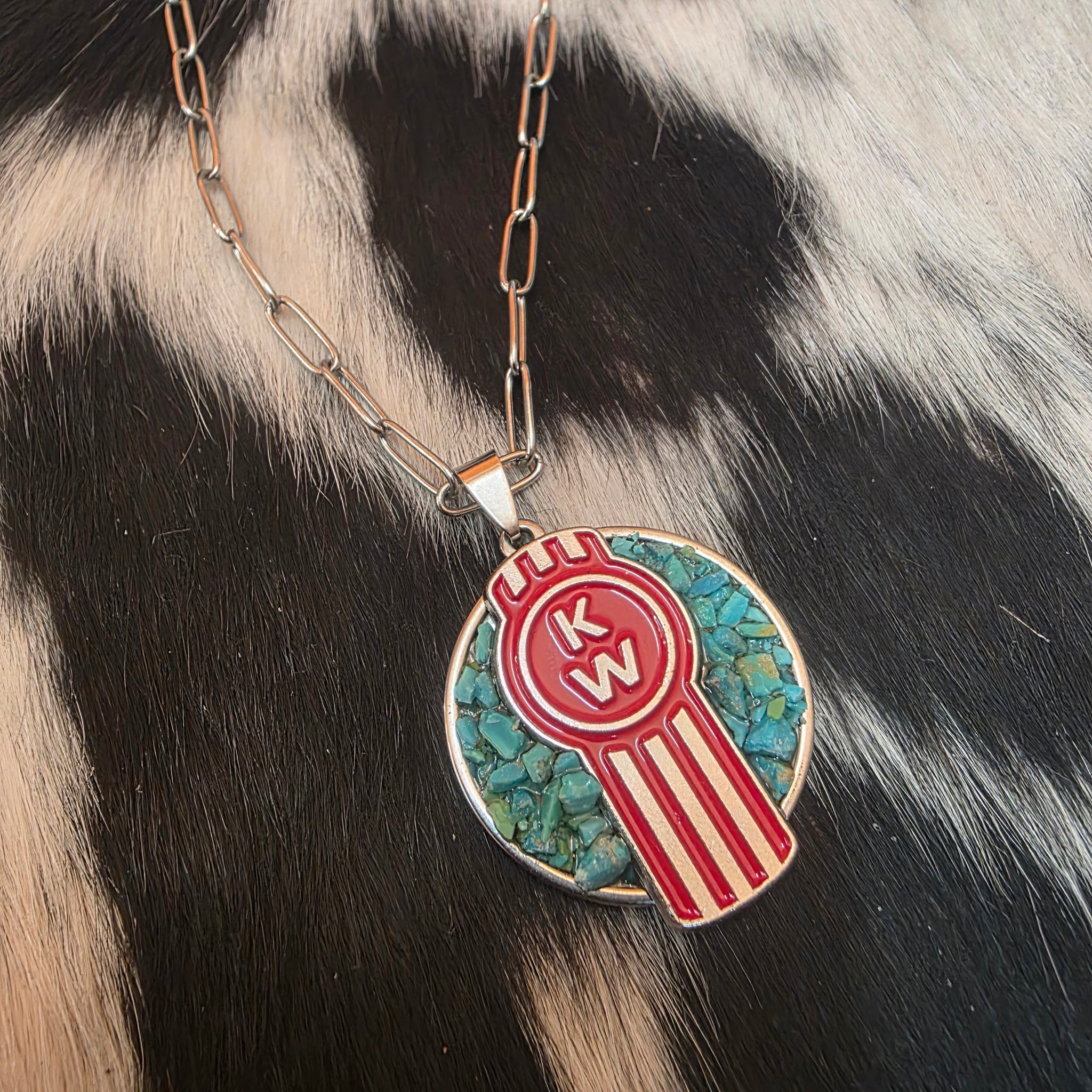 Stainless hardware/chain. Kenworth logo & genuine Arizona turquoise chips set in resin. Pendant approx 30mm.