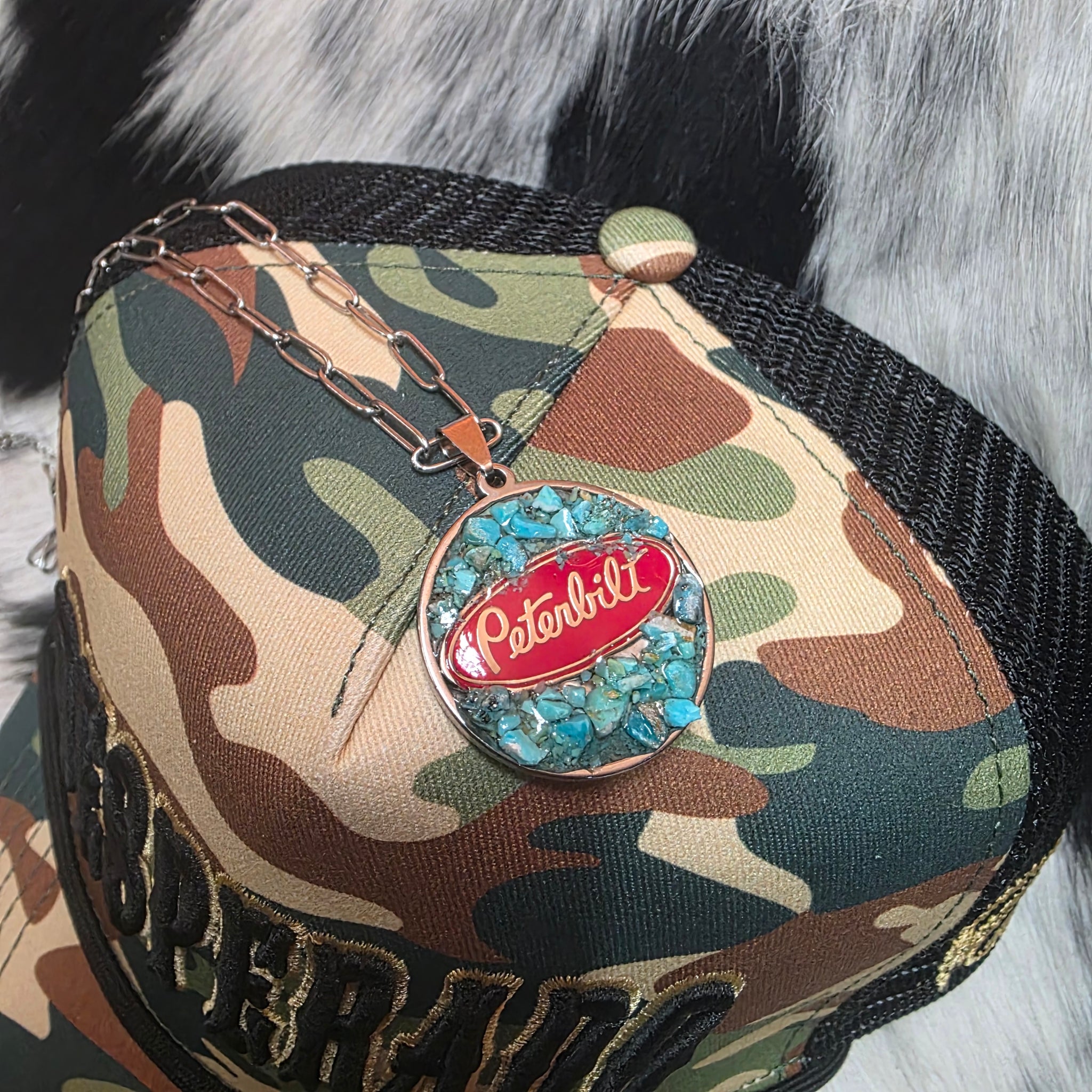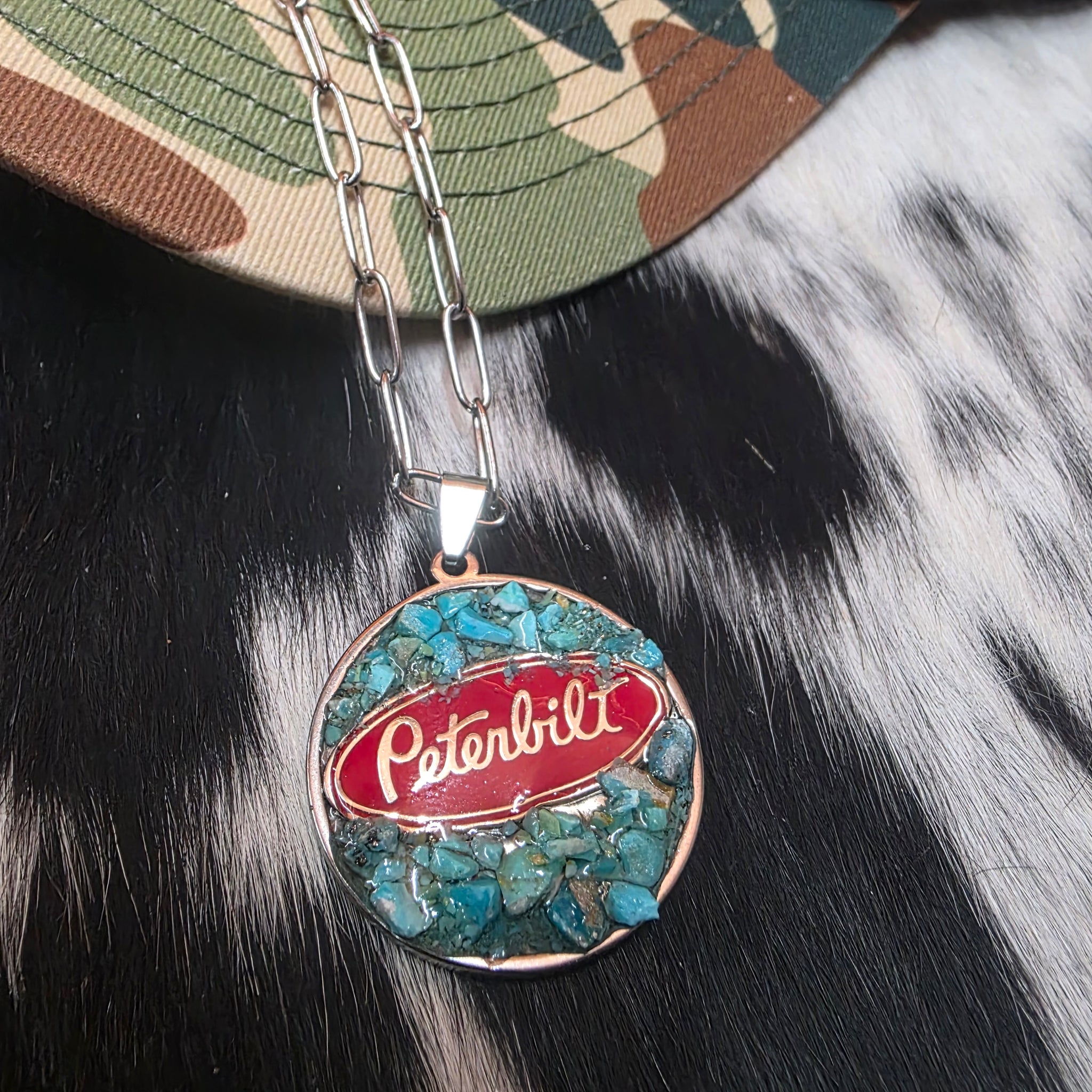 Stainless hardware/chain. Kenworth logo & genuine Arizona turquoise chips set in resin. Pendant approx 30mm.